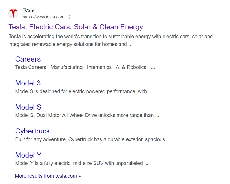 Tesla’s meta description is very short, merely 22 words. It conveys clearly what the company produces and represents and its brand value.