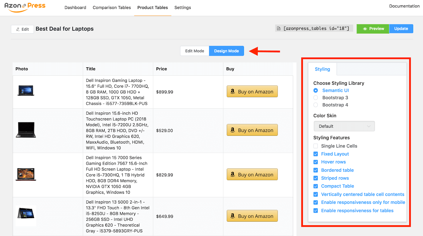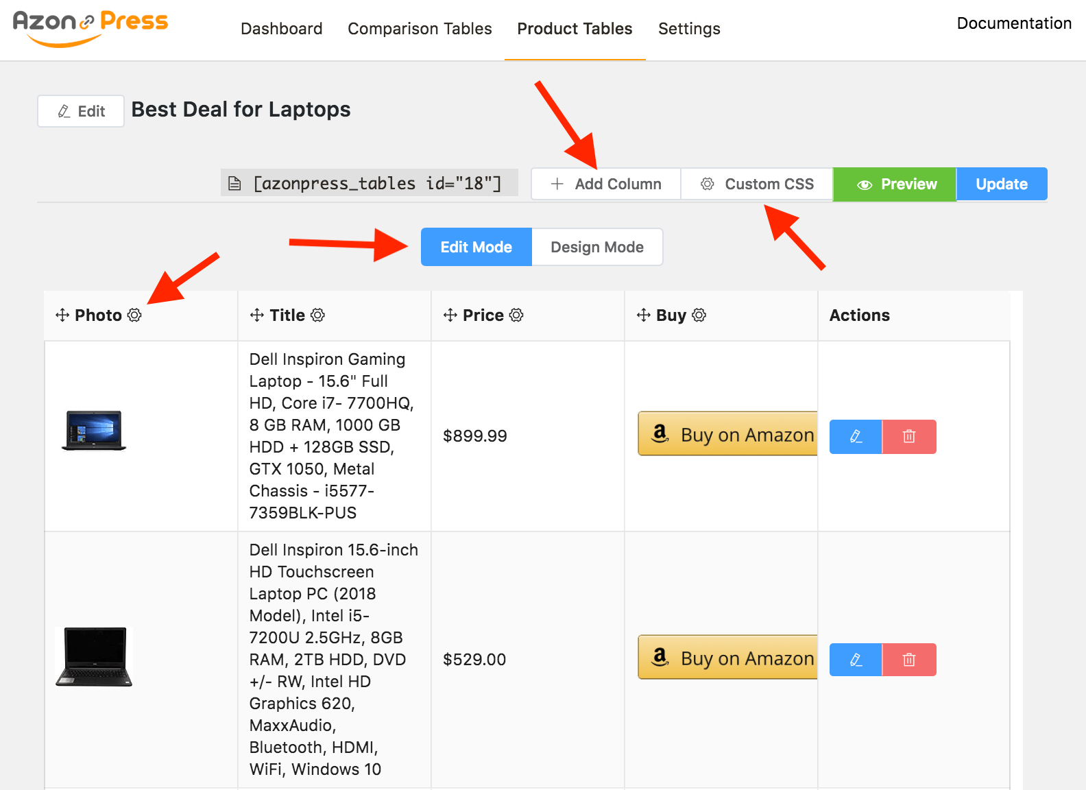 While creating Product box tables, you will get different configuration options in the plugin interface. There are 2 Modes named Edit Modes and Design Mode to customize your box tables on your site. Let’s have a look at the Edit Mode of the plugin.