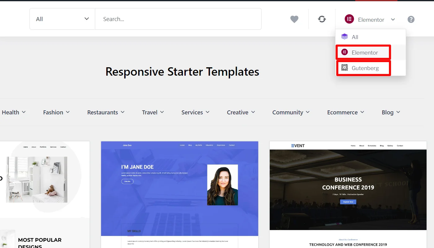 Now, you can browse the available Elementor and Gutenberg website templates. You can click on Elementor or Gutenberg based on your template requirement.