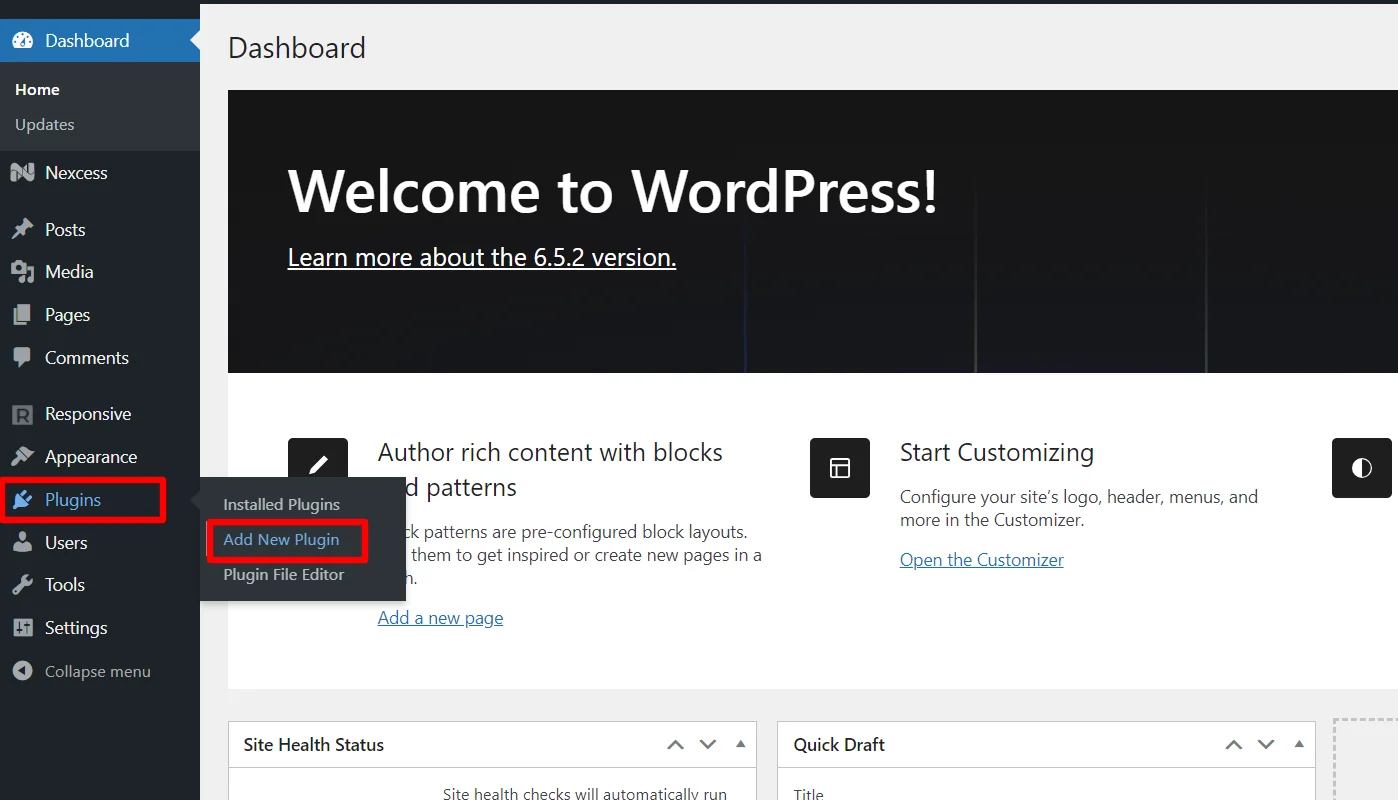 Now, to install the Responsive Addons, go to Plugins > Add New Plugin.