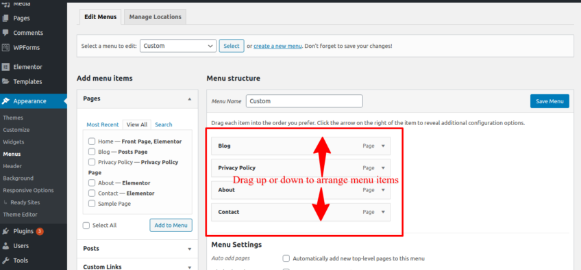 5. All your selected pages will appear under your newly created menu. You can now arrange menu items by simply dragging them up or down.