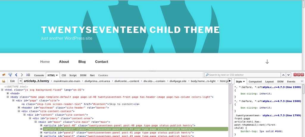 Once you have decided which CSS property you want to change, you can copy the CSS rule to the style.css file in your child folder. After saving the changes in the twentyseventeen-child/style.css file, you can see the changes when you refresh your browser.