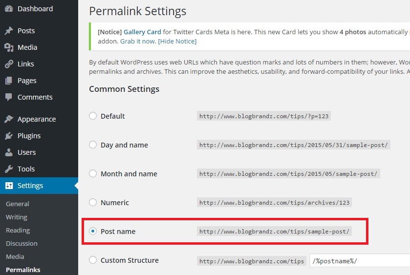 Now select the “Post Name” option in the Permalinks settings as I’ve done for this blog here, and save your settings.
