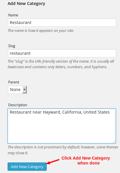 Go to WordPress Dashboard -> Listing -> Listing Categories. Specify the details & Click Add New Category when done.