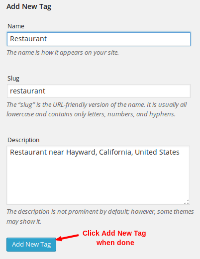 Go to WordPress Dashboard -> Listing -> Listing Tags. Specify the details & Click Add New Tag when done.