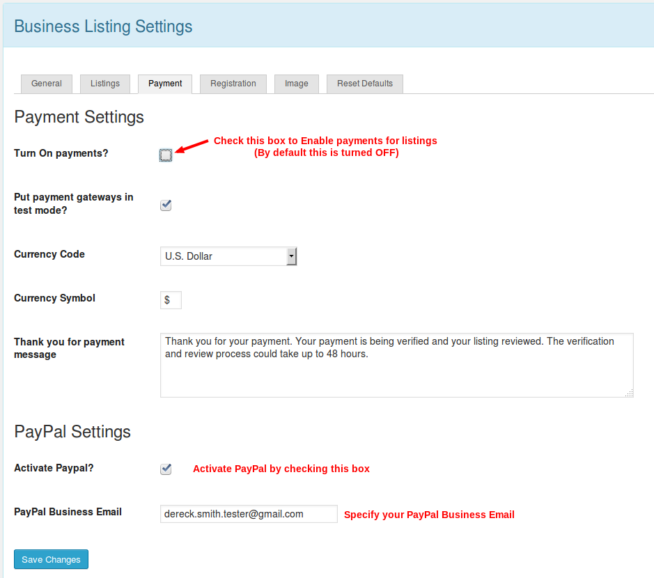 Go to WP Business Listing -> Setting -> Payment tab. Check the Turn On payments? check-box. Check the Activate PayPal? check-box. Specify the PayPal Business Email ID.