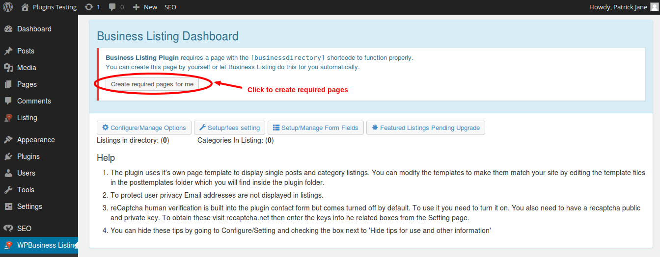 Note : Business Listing Plugin requires a page with the [businessdirectory] shortcode to function properly.You can create this page by yourself or let Business Listing do this for you automatically. Click the Create required pages for me button as shown in the image above.