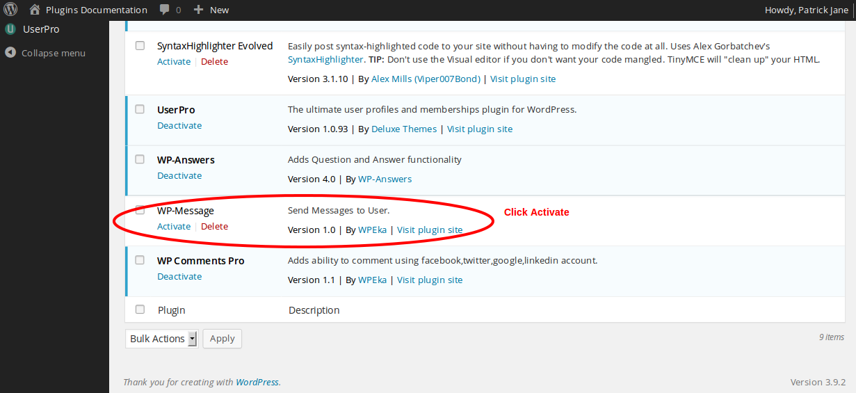Installing WP Message plugin