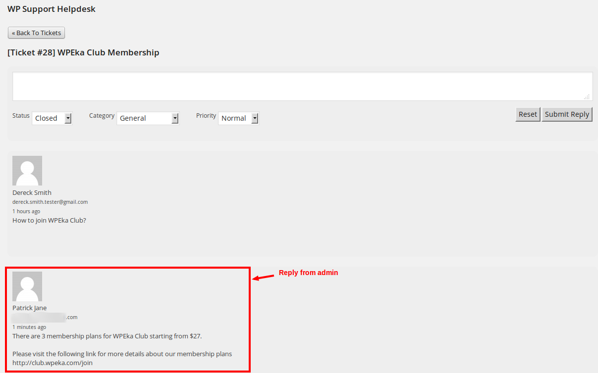 WP Support Helpdesk provides hassle-free follow-ups, allows ticket submission from the admin panel as well as the frontend.