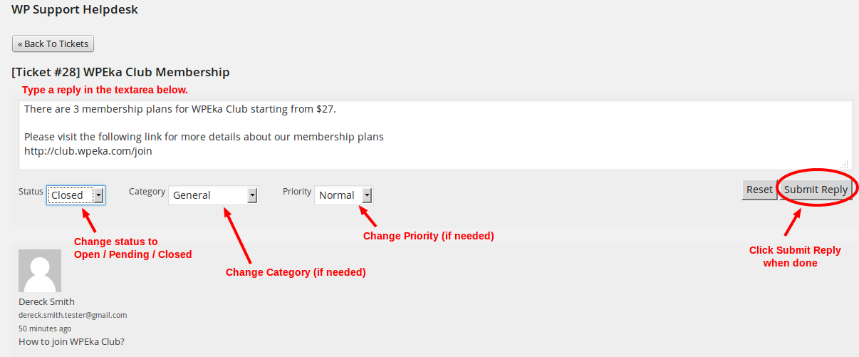 1.2 Type a reply in the text-area. Change the status of the ticket to Open / Pending / Closed. Change the Category & Priority (if needed).