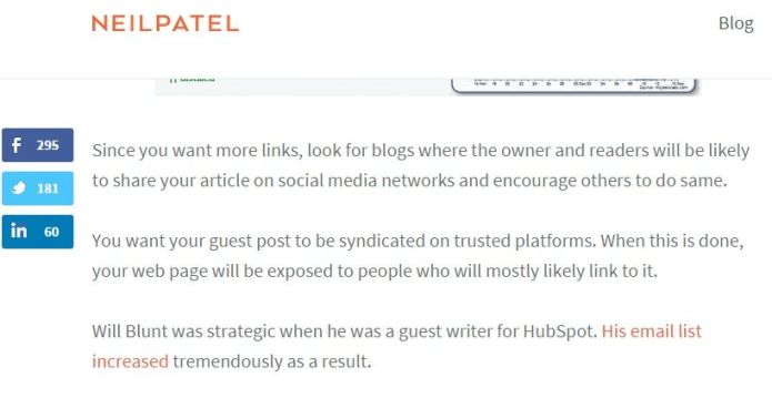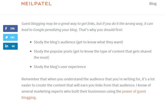 The rule of thumb for in-page formatting is that paragraphs should be no longer than 2 to 3 sentences long. Also it’s a good idea to use sub-headings, bullet points and lists to break up text. Again, Neil Patel’s blog is a perfect example of this as seen below.