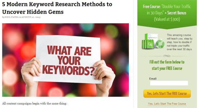 Test the best place to place your CTA, whether in the header, sidebar, footer, or half-way down your page. Again, see how Neil Patel does it unambiguously on his Quicksprout blog below.