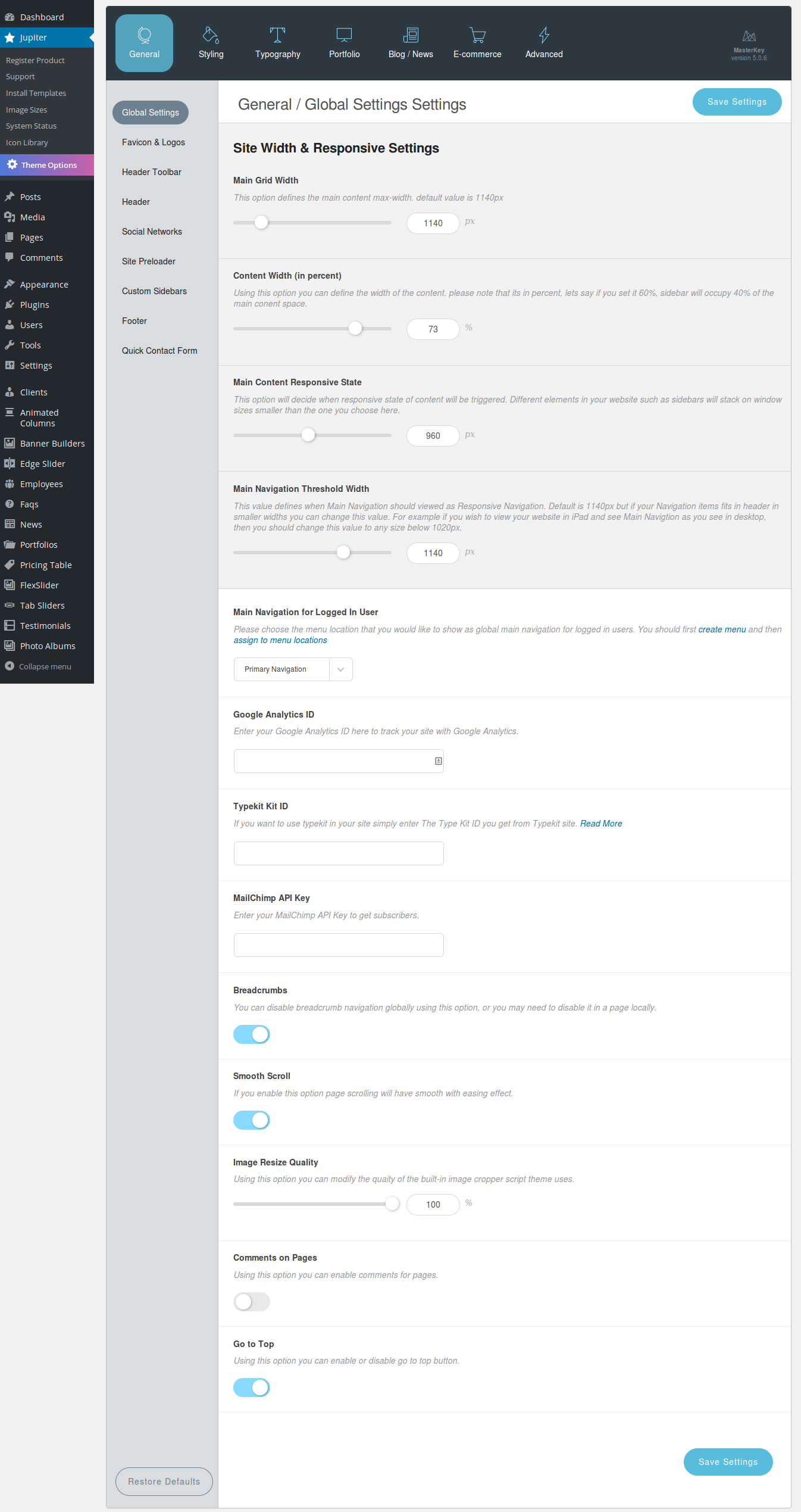 One look at the theme options of JupiterV5 & you’ll be overwhelmed. You can configure every single thing in JupiterV5. I mean everything. Head over to the WP Dashboard -> Jupiter -> Theme Options section.You’ll be presented with a screen as seen above. The level of customization is evidently & absolutely massive. This gives you the freedom to mould the theme as per your requirements. The developers at Artbees have taken the look & feel customization to a whole new level with JupiterV5.