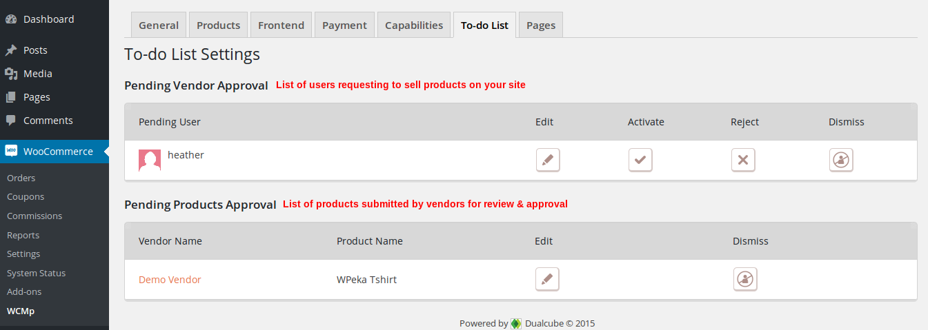 • Ability To Enable Users To Register As Vendors/Sellers: Its’s quite obvious what the extension is for but we’ll still dab into this feature because it is what the extension is based upon. If you host a WordPress e-shop site running WooCommerce then you can allow users to register as vendors/sellers. These vendors’ requests will then show up in your To-do List tab where you can approve/disapprove them as vendors. The same To-do List tab will also list the products for review submitted by the approved vendors.